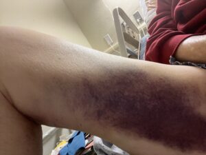 Fractured femur, post surgery, 6 days. This is opposite side of thigh from scar which has its own smaller patch of markings.